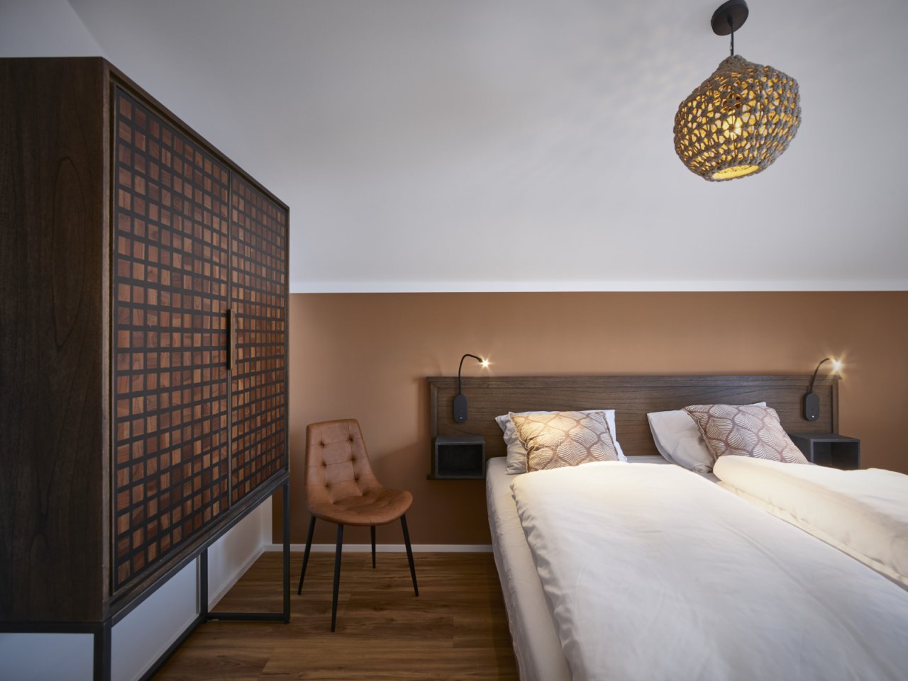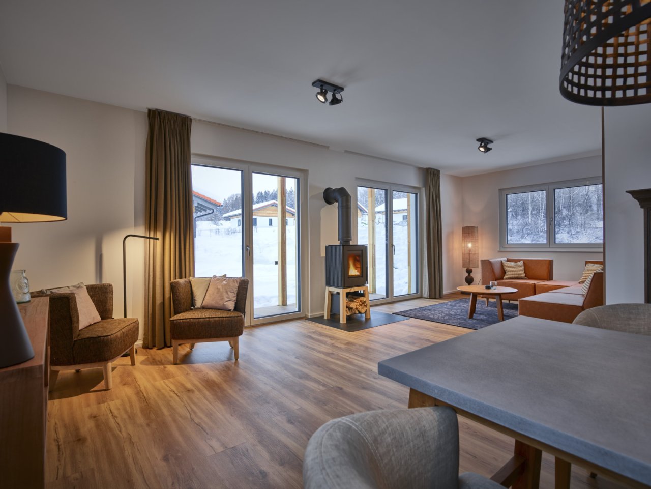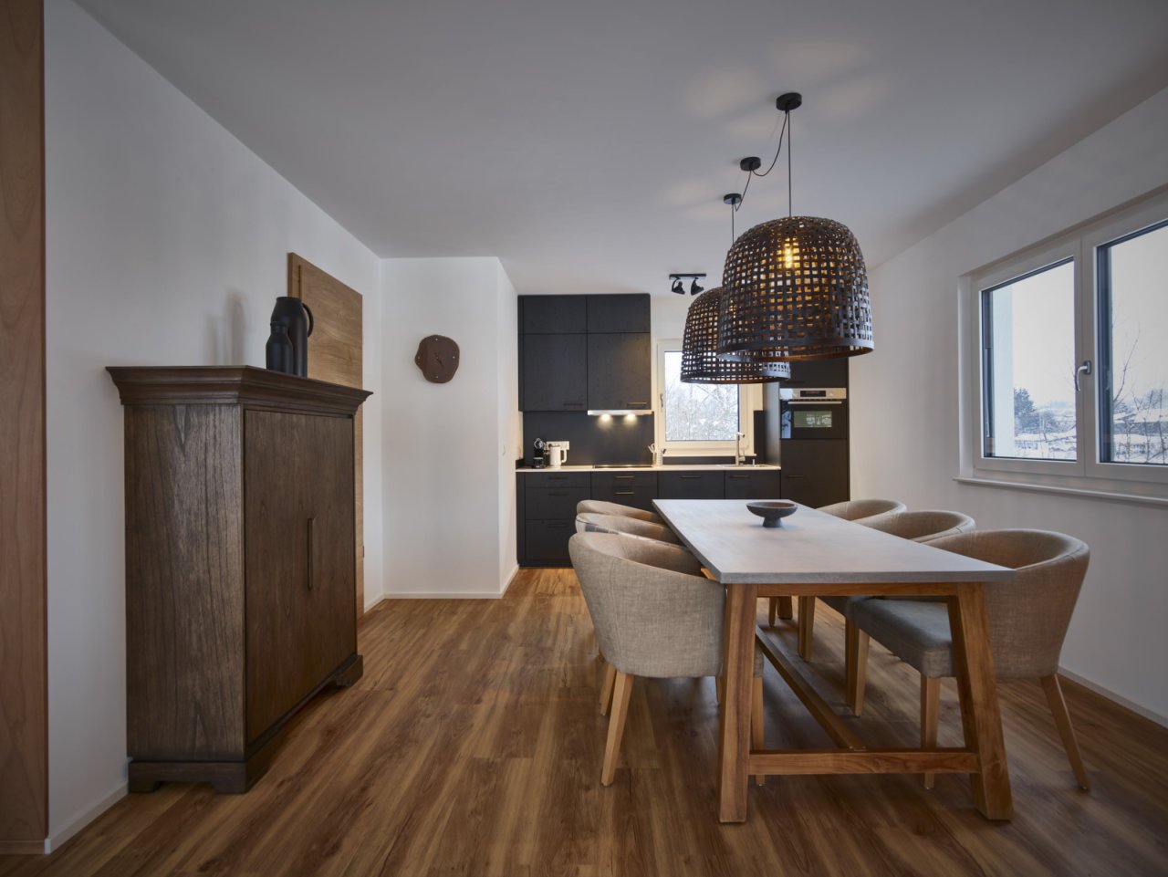 Auf rund 111 m² Wohnfläche können bis zu 6 Gäste im Chalet „Hennenkobel“ wohnen. Auf zwei Geschossen erstrecken sich ein großer Wohn-, Koch- und Essbereich, drei Schlafzimmer mit jeweils zwei Betten, ein großes Badezimmer sowie ein kleineres Duschbad und zwei separate Toiletten. Auf der Terrasse oder dem auf der Giebelseite gelegenen überdachten Balkon lassen sich ruhige Stunde an der frischen Luft verbringen.