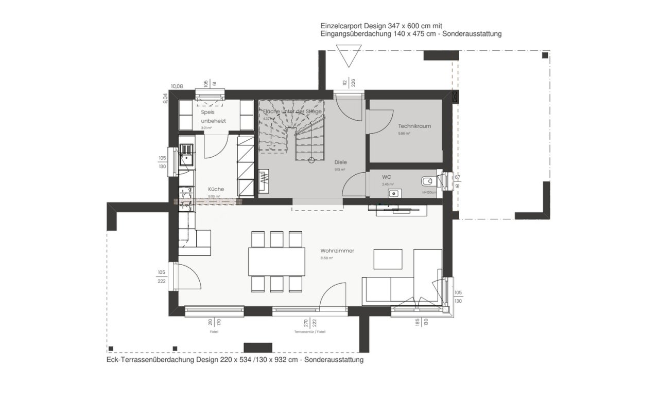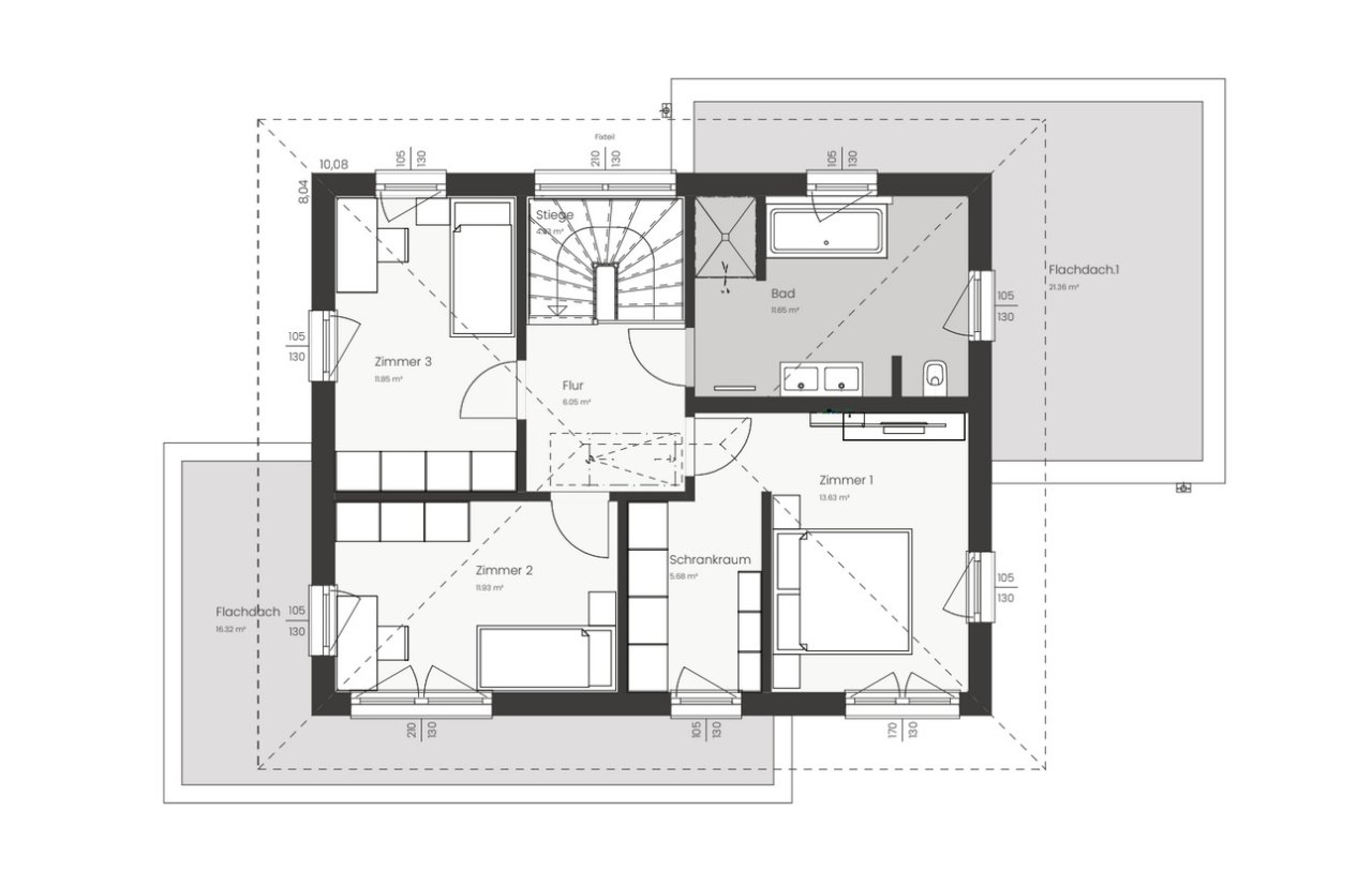 Die Raumaufteilung ist kompakt geplant, sodass möglichst wenig Fläche für Flure verloren geht und mehr Platz für Wohnräume bleibt.